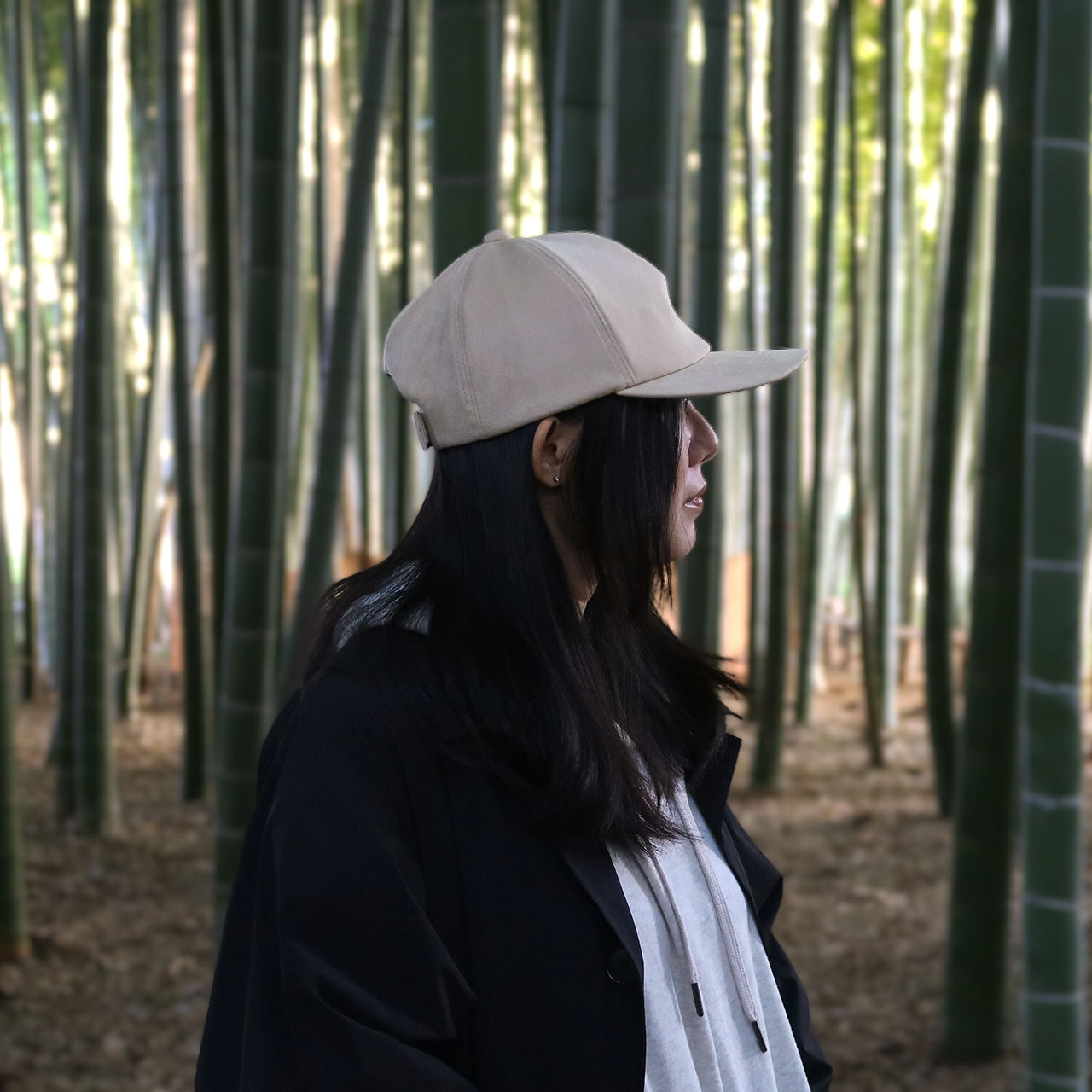 キャップというカジュアルなアイテムも、素材感のおかげで上品で大人な佇まい。ちなみにフェイクスエードという事で、こちら洗濯も可能です。