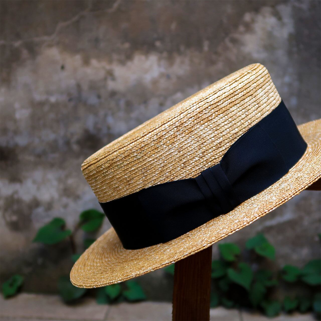 希少なヴィンテージの細麦ブレードを使用したカンカン帽デザインのストローハット。昔ながらのクラシックなカンカン帽と比べるとやや高さを出したデザインです。