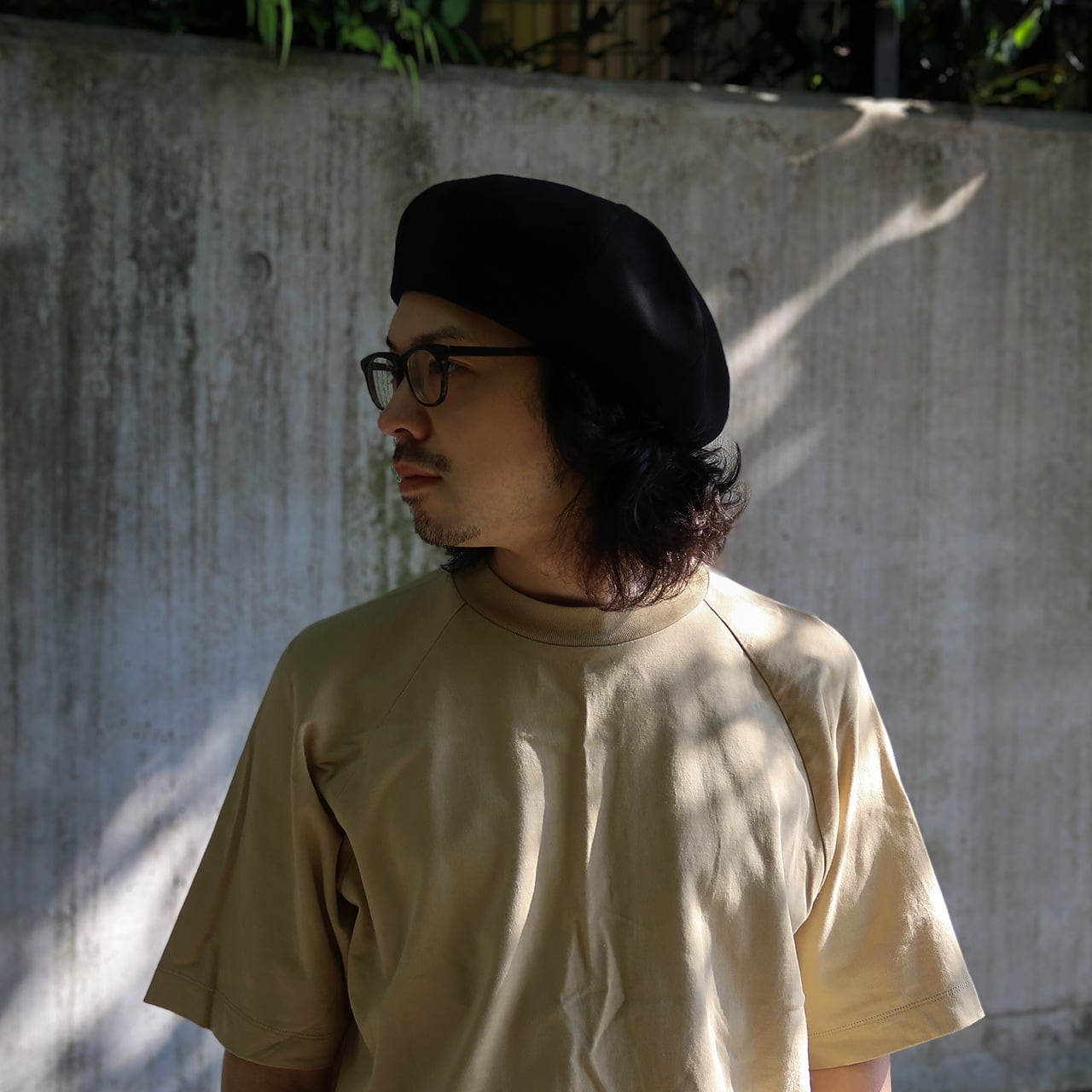 一般的なベレー帽と比べてなかなか大ぶりな作り。加えて生地がしっかりとしていてハリもありますので、被る際は左右どちらかのボリュームをしっかり倒すなど、かたちを整えて被って頂ければと。